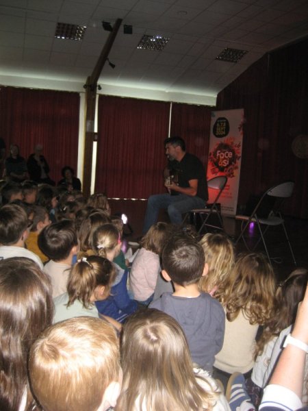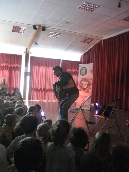 Jeudi nous sommes allés au foyer rural pour écouter Fredo du groupe des ogres de Barback. Il nous a interprété plusieurs chansons avec sa guitare et son accordéon; nous avons pu chanter avec lui la chanson que nous avions apprise “Flip flap flop”. C’était super!