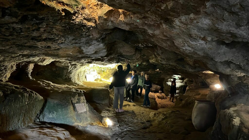Hier, on a visité le Gouffre de Proumeyssac, la cathédrale de cristal ! C’était magnifique. Puis l’après-midi, nous sommes allés au roc de Cazelle pour un atelier de peinture rupestre et de chasse à l’aide d’un propulseur. Nous avons terminé la journée avec une veillée jeux de société ou “Just dance”.