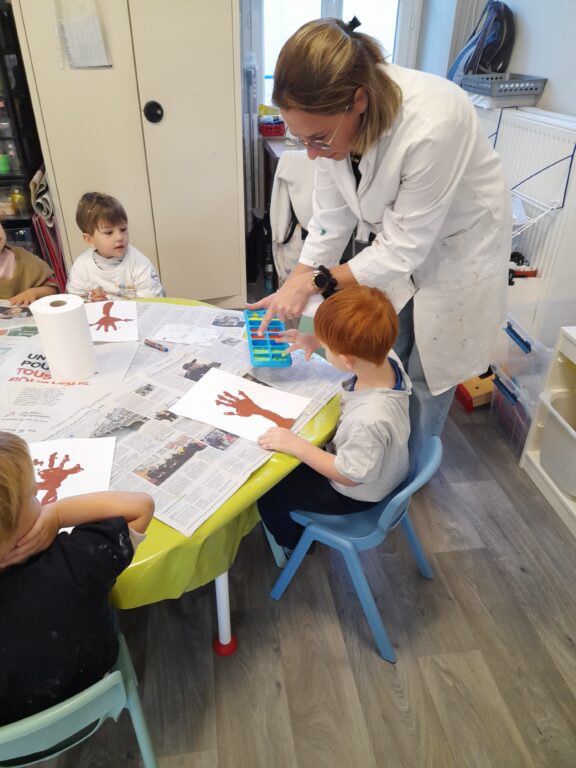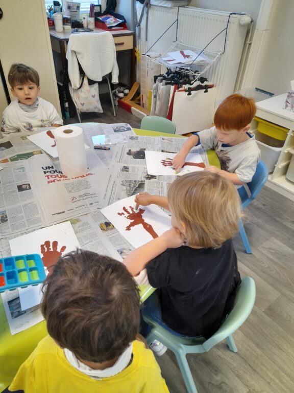 Cette semaine, avec Emilie, nous avons peint le tronc d’un arbre à l’aide de notre bras et notre main. Puis nous avons laissé nos empreintes de doigts pour représenter les feuilles.