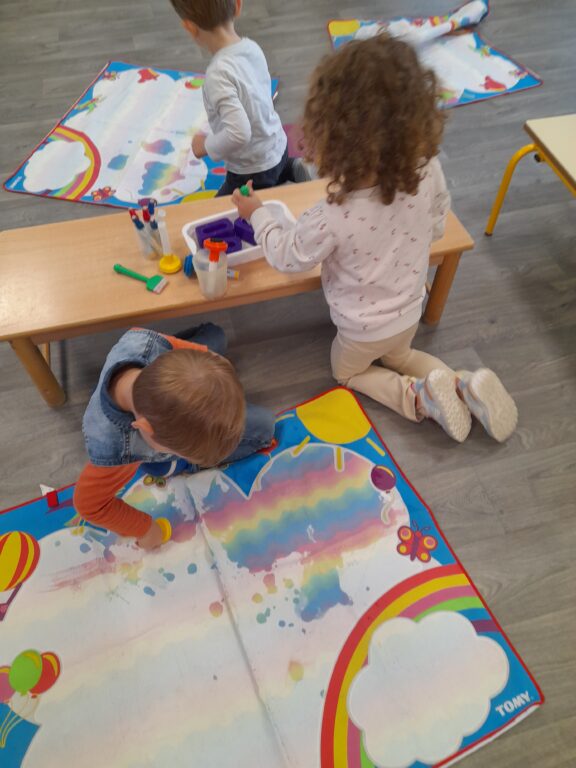 En TPS/PS : semaine du 13 au 17 Octobre 2025.Par Caroline Nicolleau / 15/10/2025 Cette semaine, nous avons terminé nos champignons. Ils sont accrochés au plafond de notre classe.Nous avons réalisé notre première peinture libre.Nous utilisons “l’Aquadoodle” , tapis pour écrire avec de l’eau.Nous modelons des boules, avec la pâte à modeler, pour créer des pommes sur notre pommier.Avec Caroline, nous jouons au jeu ” J’ai…qui a…” autour du vocabulaire de l’Automne.