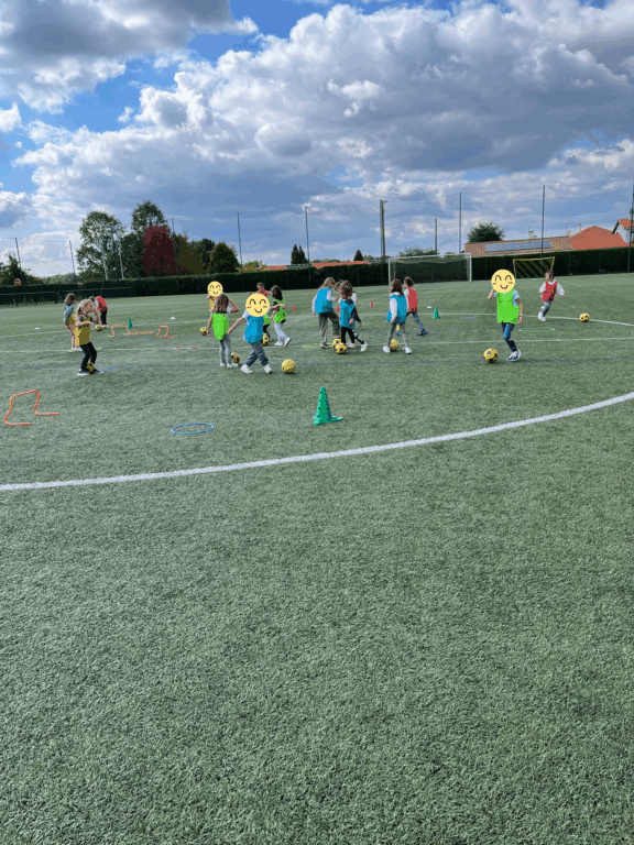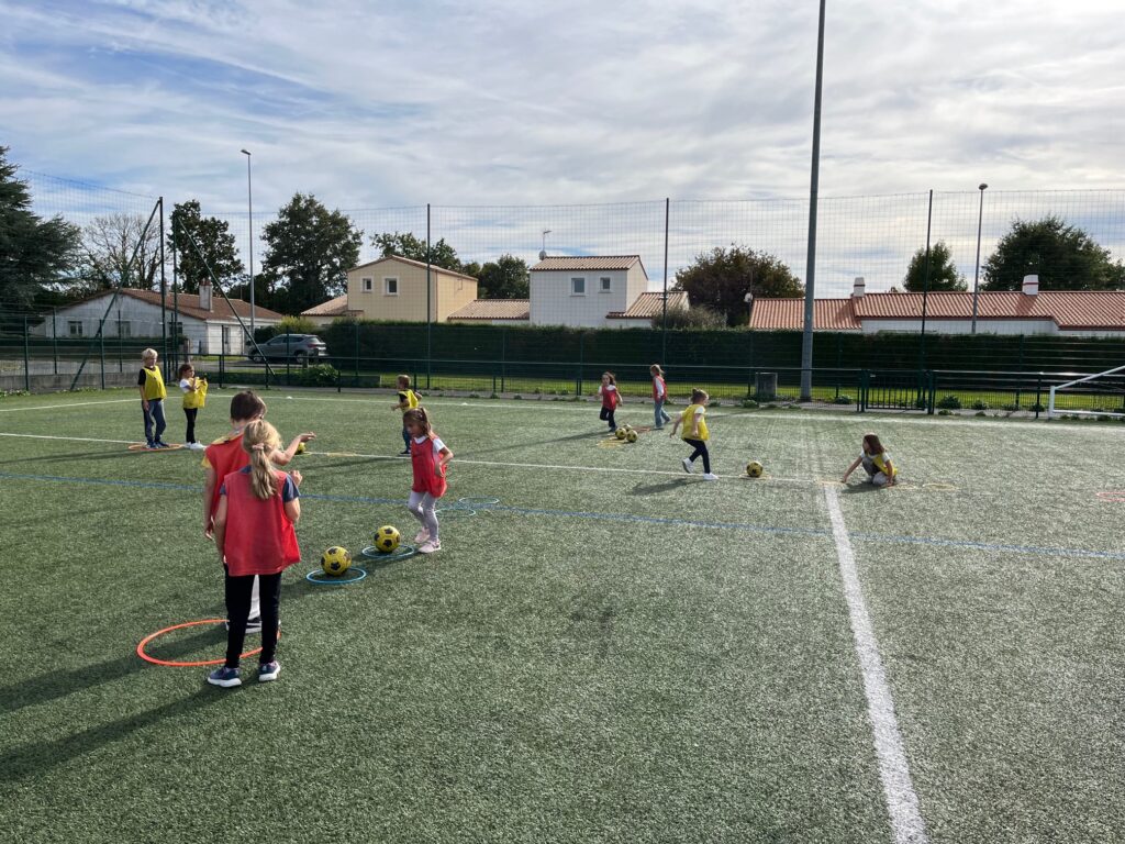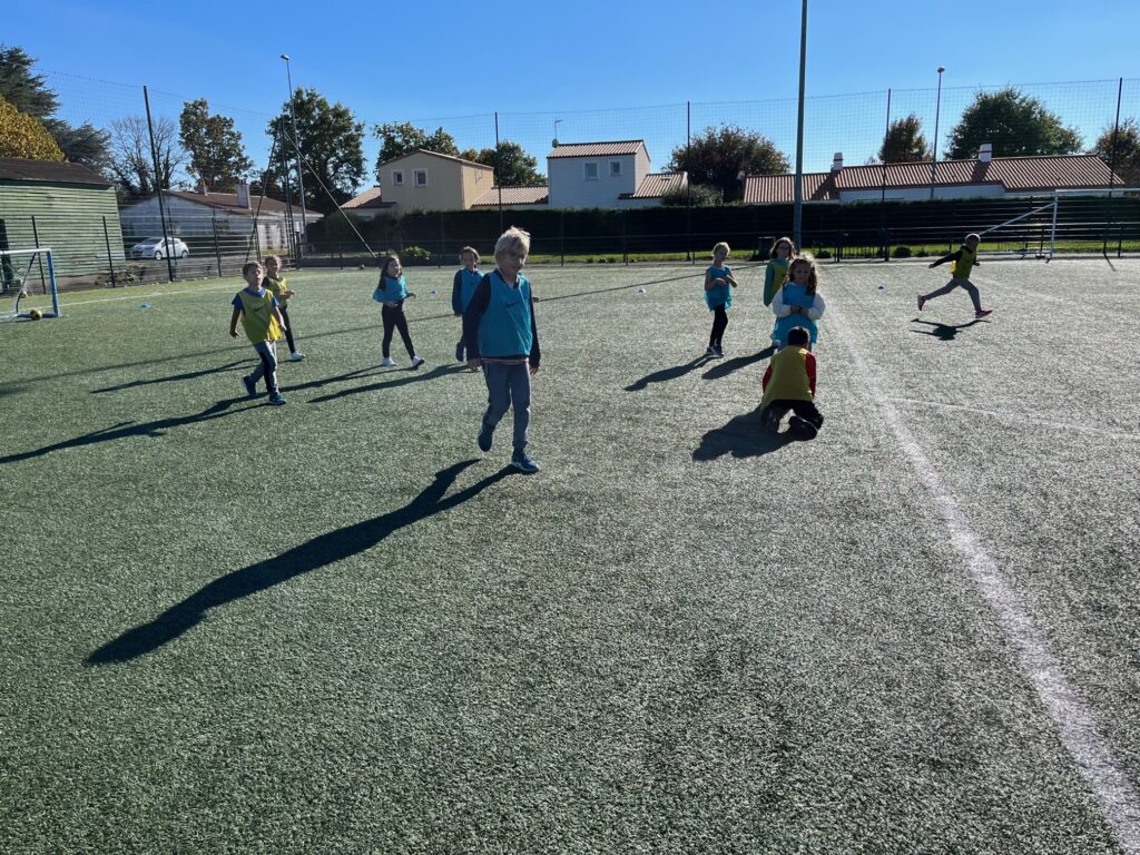 Nous avons appris à nous déplacer avec le ballon grâce à des jeux comme les éperviers, 1,2,3 soleil, puissance 4, les trésors… Enfin, nous avons disputé des matchs avec des “ballons magiques” qui entrent dans le jeu dès que le ballon sort du terrain.