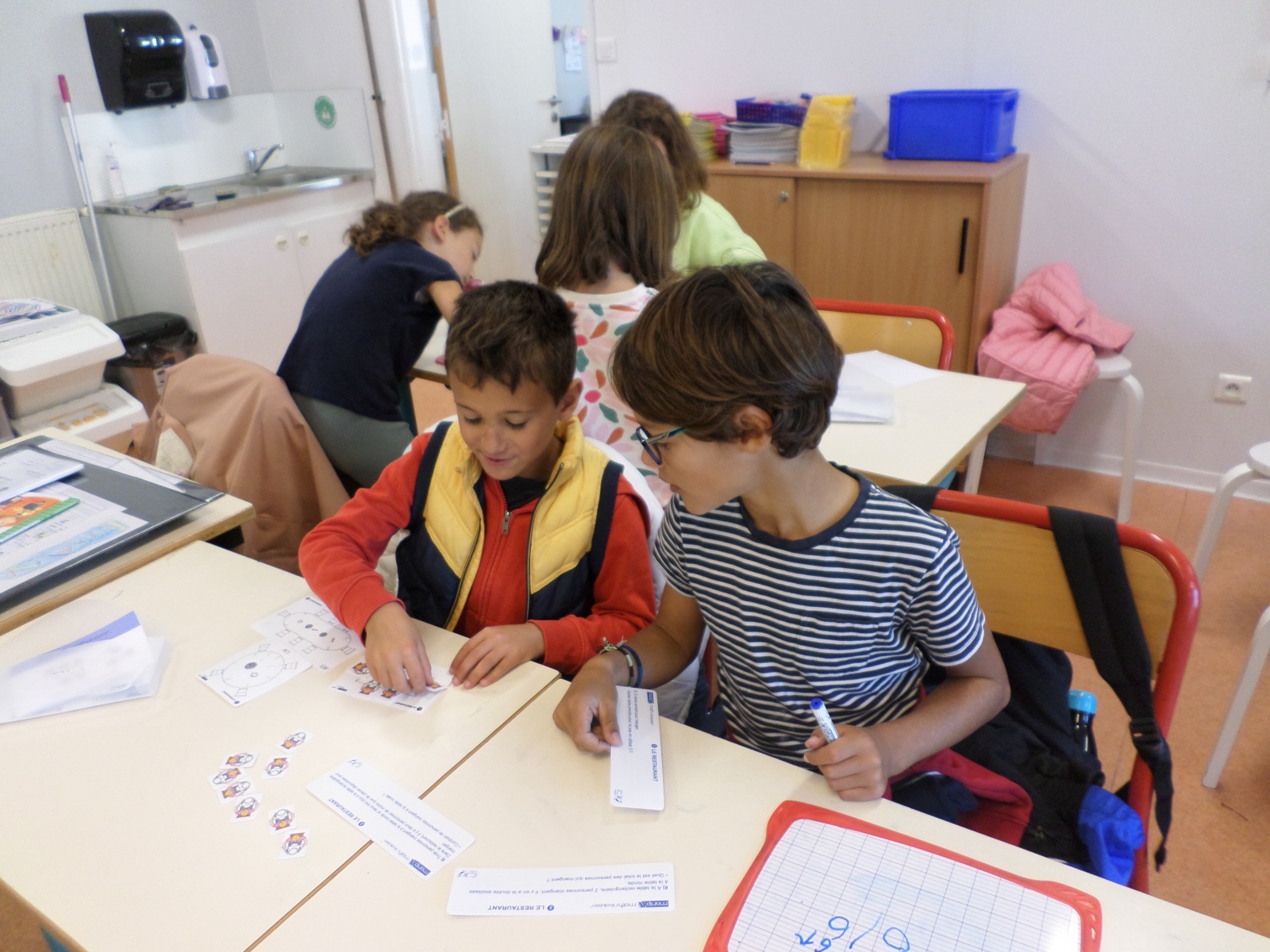 Cette période, les CE1 des deux classes se retrouvaient le mardi après-midi pour faire des ateliers de français (compréhension lecture…) et mathématiques (problèmes, calculs…). Ils faisaient ensuite une séance de sport avec les élèves de la classe Arc-en-ciel (jeux collectifs, petits jeux de coopération…). Voici quelques photos de ces temps de rencontre entre les trois classes.